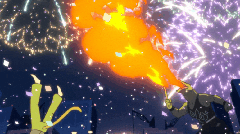 보시다시피 디자인은 뭉툭하고 단순한 것이 기존 트리거사 작품들과 동일합니다. 기존 트리거사의 작품들이 대부분 아노하나처럼 둥글둥글한 이미지거나 뚜렷하고 진한 선처리로 단순한 디자인이었죠. 본 작품은 전자에 해당합니다. 트리거사 특유의 밝으면서 다채로운 색채도 여전합니다. 호불호가 있는 부분이지만 필자는 개인적으로 좋아합니다. 퀄리티는 전반적으로 준수한 수준이라고 생각합니다. 일류라고 하기에는 미려함이나 섬세함이 많이 부족하지만 작붕이 거의 없고 안정적인 점에서 꽤 준수한 작화라고 할 수 있을 것 같네요. 액션이 강점이었던 기존의 트리거 작품과는 다르게 이번 작품은 후반부 빼고는 액션이 별로여서 아쉬웠습니다.